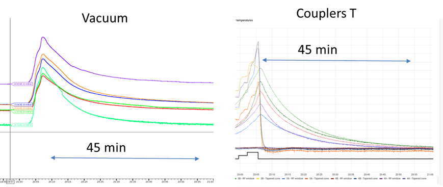 While the RF-RFQ conditioning reached 15%DC at nominal (for deuteron acceleration) cavity voltage of 132kV and 35%DC at 80% level cavity voltage of 106kV, it was stopped on March 30 due to vacuum interlock events. Preliminary investigation pointed out that the time needed by the system to recover the RFQ base vacuum after the vacuum peaks follows the same trend than the temperatures measured in correspondence of the RFQ couplers ceramic windows (see below graphs). Consequently, leaks at the RF couplers viton O-rings are suspected. Intensive leak checks have been performed, first by using Kr gas sprayed in pockets around the windows to be detected by the RFQ RGAs and then by using Helium, following a more standard He leak test by isolating the cryopump and using a mobile trolley. Following the increase of DC during the last months of conditioning campaign, the ceramic windows may also have experienced metallization. Further inspection of the couplers will tell us more if changing ceramic windows and O-rings should be considered. Even though spares are available on-site, the diagnosis of the issue (with the great support of INFN) is our first focus to clearly identify the coupler to be opened because the intervention will be quite invasive (with the need to disassemble the coaxial lines and disconnect them in the pit for couplers located on the north side).